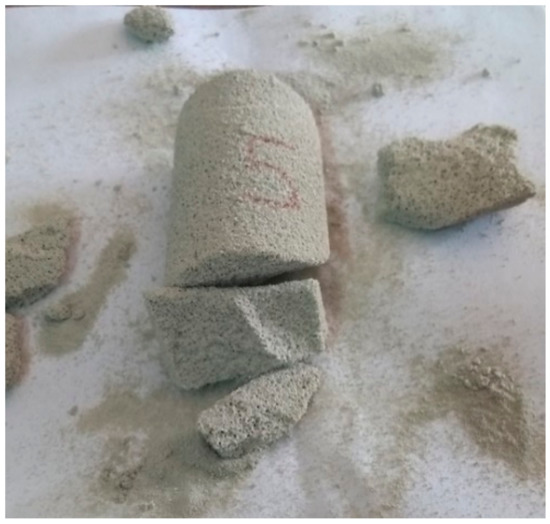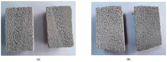 It is interesting to note that (important/macro-) cracks were not observed in any of the analyzed cases. It was evident that the damage and failure process in foam concrete was represented by the disaggregation of the material skeleton. It was also observed that this disaggregation process always occurs in coincidence with the zone where the loads are concentrated. To confirm the latter, the tested samples number 7 and 9 in Figure 10b were cut using a band saw and analyzed. The cut samples are presented in Figure 12, in which it can be observed that damage was not appreciable in the middle of the height but was considerable at the upper and lower extremes of the specimens.