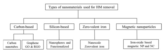 Carbon-based NM, such as carbon nanotubes, Fullerenes, activated carbon, graphene, and graphene oxide, have been widely used in energy storage, sensors, electronics, water purification, drug delivery, and disease diagnosis [35]. In addition, their unique properties also allow the removal of both organic and inorganic pollutants, making them a promising alternative for treating wastewater. They are therefore considered as one of the most promising adsorbents for metallic pollutants [36,37].