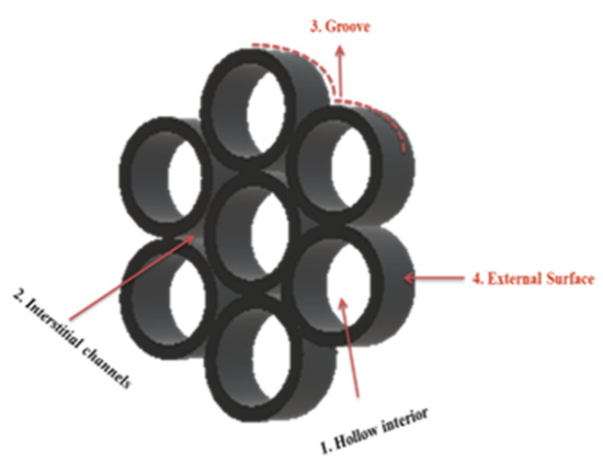 Carbon nanotube (CNT) adsorbents are widely employed for metallic pollutant extraction [38]. They are broadly classified into single walled carbon nanotubes (SWCNT) and multi-walled carbon nanotubes (MWCNT), and both are extensively tested for the removal of heavy metals [39,40,41]. In the case of CNT, the adsorption process is usually controlled by four possible active sites: (i) the hollow interior of individual CNT designated as internal sites; (ii) the interstitial channels between CNT in the stacks; (iii) the grooves between adjacent CNT; and (iv) the external surface of individual CNT [42,43] (Figure 2). The sites of interstitial channels and grooves are responsible for initializing the process of adsorption, which is then followed by the adsorption of the contaminants on the external walls and the accumulation of molecules on internal axial sites. From a kinetic point of view, internal sites are more inclined to acquire the equilibrium state than the external sites under the same conditions. Therefore, increasing the binding sites on the CNT surface can undoubtedly enhance the saturation capability and kinetic rate. The applicability of CNT in wastewater treatment is dependent on several factors including the cost to complexity of CNT functionalization, the necessity for solid and liquid segregation, the type of wastewater, and the recycling cost and efficiency.