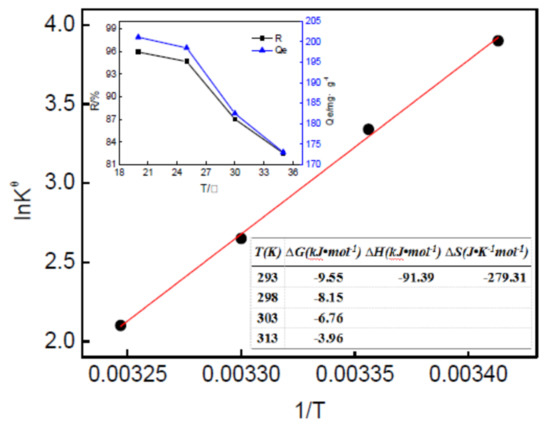 Van’t Hoff fit curve (inset at the upper left corner: dependence of adsorption on temperature, at the lower right corner: values of adsorption thermodynamic functions). Reproduced under creative commons agreement from [64].