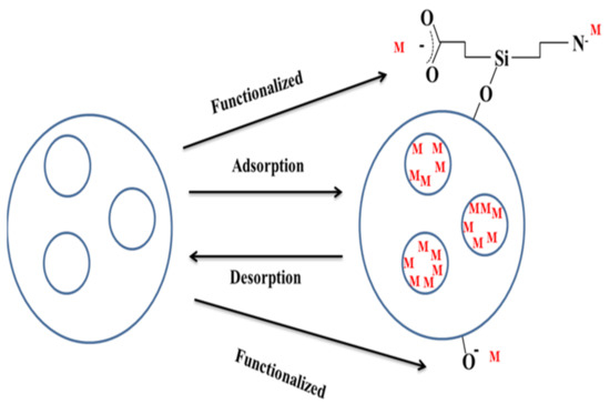 Another important category of nanomaterials are Silica-based nanomaterials, which are widely used for removing HM ions owing to their non-toxicity and excellent surface characteristics [72,73]. The different possible interactions between mesoporous silica and metallic ions are shown in Figure 4. The surface of the mesoporous silica can also be functionalized with groups, such as amine (–NH2) and thiol (–SH), which enhance interactions with heavy metal ions and their possible extraction from water. Table 4 summarizes previous studies reporting the functionalization of mesoporous silica applied to heavy metal ion removal.