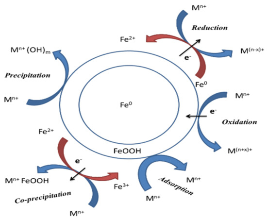 Zero-valent metal nanoparticles have demonstrated their ability in remediating a variety of pollutants in wastewaters [82]. For instance, Ag NP are more particularly used for disinfecting wastewater owing to their antimicrobial/antifungal properties [83]. Nanoscale zero-valent iron (nZVI) can be defined as a composite consisting of Fe(0) and ferric oxide coating [84]. The nanosize of nZVI results in a higher surface to volume ratio or higher specific surface, which leads to an increased removal of pollutants [85]. Therefore, they have received considerable attention in the scientific community as a novel adsorbent to remediate a variety of heavy metals, including Hg2+, Cr6+, Cu2+, Ni2+, and Cd2+ [86,87,88]. In fact, nZVI is an excellent electron donor (see Equation (1)) with a reduction potential greater than −0.447 V, highly capable of reducing pollutants; the feasibility of the reduction depends on the redox potential of particular metal ions. For example, metal ions such as Zn or Cd have lower or almost similar reduction potential (i.e., −0.76 V and −0.40 V vs. Standard Hydrogen Electrode (SHE), respectively) than that of Fe, which interrupts the surface redox phenomenon of nZVI [89]. Subsequently, the removal of a particular pollutant (i.e., heavy metal ions) can occur through various processes such as precipitation, complexation, adsorption, oxidation, and reduction, which are briefly schematized in Figure 5.