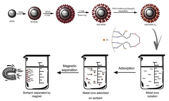 Even though the nanomaterials described above showed an enormous capacity in the extraction of heavy metals, they carry certain limitations with regards to their cost-effectiveness, reusability, separation from aqueous solutions, and complex synthesis routes, which impede their utilization at a commercial scale. During the last two decades, micro and nano-scaled magnetic particles have attracted attention as adsorbents for eliminating the biological molecules, organic pollutants, and heavy metal ions from water and wastewater [94]. The major advantage with magnetic nanomaterials lies in their easy recovery after exhaustion from the treated solution by applying an external magnetic field, as shown in one of the studies carried out using magnetic mesoporous silica nanospheres for the extraction of Pb2+, Hg2+, and Pd2+ (Figure 6) [95].