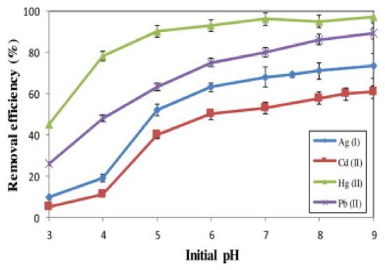 Akhbarizadeh et al. studied the removal of Cu2+, Ni2+, Mn2+, Cd2+, and Cr6+ using maghemite NP with initial concentration of 50 mg/L. They observed removal efficiencies of 88.2% for Cu, 84.4% for Cr, 18.3% for Mn, 15.7% for Ni, and 8.4% for Cd [98]. This study also indicated that removal of these five different metal ions by maghemite reached an equilibrium after a short period (10 min). Moreover, the absorption showed a good fit for Langmuir isotherm verifying the monolayer coverage of metallic ions on maghemite surface. In fact, authors highlighted a pH dependence during the extraction, when other effective parameters were kept constant (see Figure 7). The removal efficiency of copper increased from 8.4% to 50% when the pH was increased from 3 to 5. This study shows that selective removal of particular metal ions is feasible with these magnetic nanomaterials.