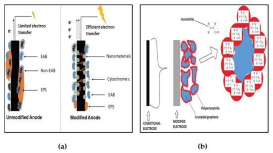 The anode in MFC can be upgraded by using nanomaterial coatings, which provide a high specific surface, an improved electron transfer and promote electroactive biofilm. These enhance the power output of the MFC, as shown in Figure 9 [147]. Iron oxide can facilitate the extracellular electron transfer through two pathways; within the biofilm in the form of an electrical conduit or at the interface by accumulation on the cell surface [148]. Most of the metal oxides are not conductive but nevertheless promote and enhance biofilm formation. Thus, in this regard, carbon conductive materials or fillers e.g., CNT, Graphene, etc., can enhance the electrical conductivity of the metal oxides and thereby increase the extracellular electron transfer from the organism to the anode. Zhao et al. studied the possible increase of bio-current generation using ionic liquid functionalized graphene nanosheets as an anode [149]. They showed that current density increases from 0.40 mA/m2 to 2.8 mA/m2 within 30 h if the carbon paper anode is replaced with graphene nanosheets. The continuous testing on bare pencil graphite electrode (PGE), α-MnO2/PGE, PANI/PGE, and α-MnO2/PANI/PGE were evaluated in glucose-fed-Escherichia coli-based MFC.