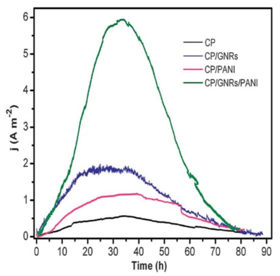 The experimental results showed that the α-MnO2/PANI/PGE-coated anode showed highest current and power density, which was 6 times higher than for uncoated PGE. Polyaniline networks grown on graphene nanoribbon-coated carbon paper as anode was reported to potentially increase the performance of MFC. When the carbon paper anode was coated with graphene nanoribons the current density increased from 0.52 mA/2 to 1.8 mA/m2 [150]. The current density is dependent on the type of material used, as shown in Figure 10. Reduced graphene was also coated with Polyaniline (PANI) in carbon cloth [151]. Biosynthesized α-MnO2-based polyaniline binary composite were investigated as a biocatalyst in MFC [152].
