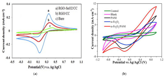 Similarly, the anode modified with reduced graphene oxide/tin oxide nanocomposite showed a significant increase of 4.8 times in the power density of MFC compared to its bare counterpart, as shown in the cyclic voltammetry curves reproduced with permission from [153] (see Figure 11a).