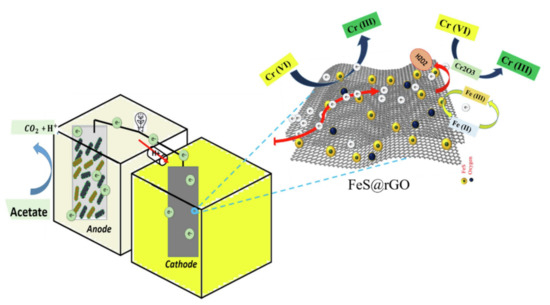 Possible mechanism of Cr(VI) reduction at FeS@rGO decorated cathode in MFC. Reproduced with permission from [169].