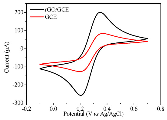 In Figure 1, it is possible to notice that after the modification of the GCE with rGO, there was an increase in both the faradaic and the capacitive current, indicating electrode modification [20]. Using the Randles–Sevcik [28,29,30] equation (Equation (1) it was possible to calculate the electroactive area of the electrodes, showing that after GCE modification the electroactive surface area (ECSA) increased 64% (ECSA of GCE = 0.042 cm2, ECSA of rGO/GCE = 0.069 cm2).