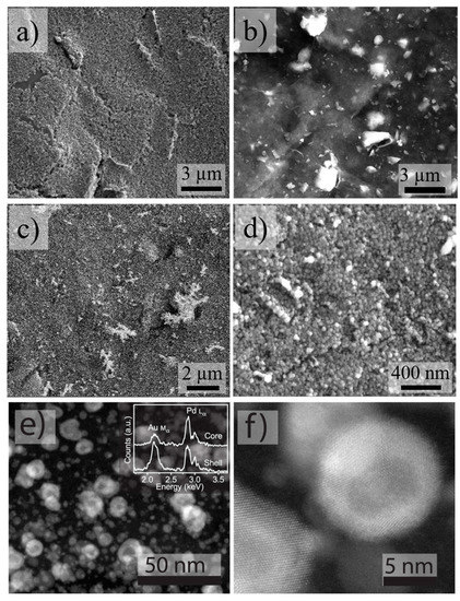 SEM (a–d) and TEM images (e,f) of the electrode revealing details of the fabrication steps. (a) Conventional SPE electrode. (b) SPE modified with rGO. (c) and (d) the electrode with core-shell gold–palladium nanoparticles. (e) STEM image showing the core-shell gold–palladium nanoparticles. The EDS elemental analysis is shown in the inset. (f) Details of the core-shell nanoparticles using high-resolution STEM (HR-STEM).
