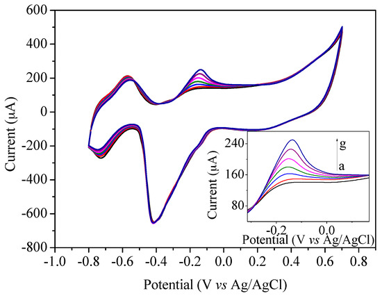 The cyclic voltammograms for different glycerol concentrations using Au@Pd/rGO/GCE in 0.030 mol L−1 KOH at a 50 mV s−1 scan rate. Voltammograms a–g are related to the glycerol concentrations at 0, 18.2, 36.5, 54.7, 73, 91.2, and 109 µmol L−1, respectively.