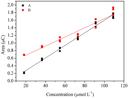According to Equations (3) and (4), the limits of detection and quantification of the electrode were 5.32 and 17.5 µmol L−1, respectively.