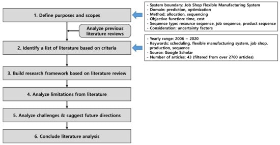 Figure 2 illustrates the research methodology; this methodology is revised from Rasheed and Wahid [], and Akbar and Irohara [], as they suggest reasonable and logical procedures for literature review and analysis. In the first step, the purpose and scope of the review are defined, as described in Section 2.2. Second, a list of literature within the target areas is identified. Here, we searched for the following keywords using Google Scholar: “scheduling”, “flexible manufacturing system”, “job shop”, “production”, and “sequence”. We obtained over 2700 articles from online journal sources. We then chose the literature filtered by only journals and international proceedings from the past 14 years (2006–2020). The determination of this duration stems from our judgment that the relevant technologies have recently been growing rapidly.