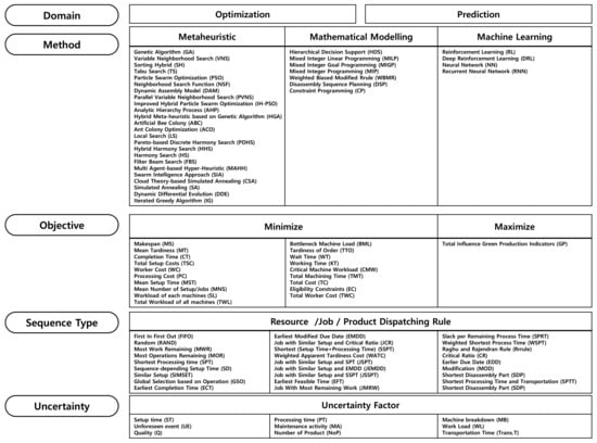 The sequence type layer indicates the sequence types and dispatching rules. Many of the articles apply common dispatching rules (e.g., FIFO, RAND, and SPT) to optimize machine and job sequences; they rely on static dispatching rules, and do not consider the dynamics and changes of such sequences during production. Moreover, the availability of product sequences is not meaningfully incorporated, despite its significant influence on machine and job sequences.