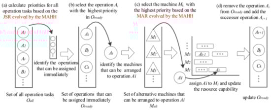 Sequencing refers to the order of processing a set of tasks over available resources []. Naturally, sequencing involves the determination of the allocations and flows of a set of tasks with regard to resources, products, and jobs. Sequencing is typically complex in JS-FMSs. Uncertainty also forces sequences to be changed and disrupted frequently. Thus, sequencing should be determined prior to scheduling, and it should be adaptively updated whenever changes occur in an actual JS-FMS. Sequences can be divided into three categories, as shown in Figure 1. The resource sequence is related to the macro-level process flow, as determined by resource allocation. The product sequence represents the flows and positions of individual products on a certain resource. This sequence allows the traceability of products. The job sequence refers to the micro-level process flow occurring in each job. The product sequence needs to be considered as an important viewpoint, because schedules that necessitate the calculation of time-domain performances can be feasibly created after the product sequence has been identified preferentially.