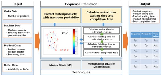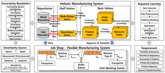 Scheduling refers to the allocation of limited resources over time to perform a given set of jobs []. Scheduling involves two types of decisions: (1) allocation decisions—that is, which machines will be assigned to perform the given jobs—and (2) sequencing decisions—that is, which and when jobs will be performed in the designated machines []. Production scheduling is generally established based on dispatching rules that include earliest due date (EDD), shortest processing time (SPT), and first-come-first-serve (FCFS) []. However, such stationary dispatching rules may cause large discrepancies between schedules and actual results, owing to the dynamics and uncertainty in JS-FMSs. In addition, they rarely trace the exact locations of individual products in (near) real time, because they also rely on assumptions and approximations, as described above. In this regard, prediction is significant for scheduling so that manufacturers can foresee the allocations and sequences of product flows. Schedule prediction allows proactive actions to increase productivity or prepare alternatives to cope with uncertainty. Schedule optimization is also important to determine the best allocations and sequences under constraints, thereby enhancing the target performance. Accordingly, many previous studies have endeavored to develop mathematical and heuristic algorithms for the prediction and optimization of scheduling by considering major uncertainty factors (refer to Section 3). However, most of these studies are biased toward optimization rather than prediction.