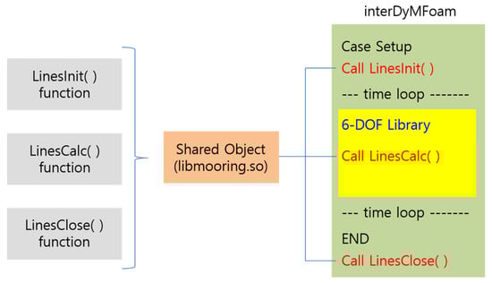 In the developed two-way coupled solver, MoorDyn was coupled to OpenFOAM as a secondary solver. Thus, the core functions in MoorDyn must be called in OpenFOAM, which is implemented by the dynamic loading of functions [17]. The core functions must be compiled into a shared library file to use the dynamic loading of the functions. As shown in Figure 3, three core functions were compiled into libmooring.so and called in OpenFOAM.
