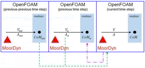 The Newmark motion solver of OpenFOAM, the implicit solver, calculates the body’s velocity first. The motions of the body later using the calculated velocity in a time step. In contrast, MoorDyn, the explicit solver, calculates the mooring tension using the velocity of the fairlead from its starting position in a time step. As such, OpenFOAM can only give MoorDyn the starting position of the fairlead in the same time step and not the velocity from the starting position when the function LinesCalc( ) is called. To resolve this problem, a delayed coupling method was used. In the delayed coupling method, as shown in Figure 4, MoorDyn uses the position (CoM) of the previous-previous time step and the velocity (V) of the previous time step to calculate the mooring system and transfers the restoring force and moment to the position of the previous time step while it works in the current time step. This resulted in a one-time-step delayed coupling, and the delayed time was 0.001 s.