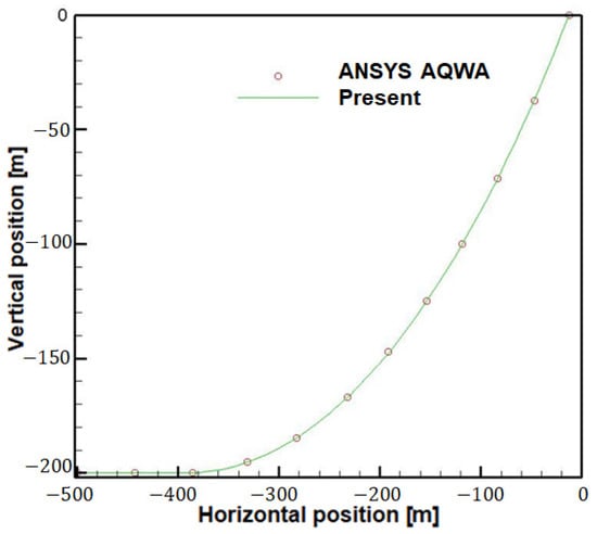 To validate the accuracy of the static profile and a load of a mooring line, the static analysis by MoorDyn was conducted. The mooring line length, diameter, weight, and stiffness were 550 m, 0.01 m, 150 kg/m, and 5.0E6 N, respectively. The results compared with the commercial software ANSYS AQWA are presented in Figure 5. The mooring line profile of MoorDyn shows good agreement with ANSYS AQWA for the line length that is laid on the seabed and the positions of the internal nodes.