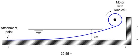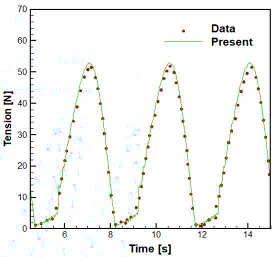 The dynamic analysis was conducted to validate the accuracy of the dynamic load of a mooring line, and the result was compared with the experimental data [19]. The experimental setup is illustrated in Figure 6, and the properties of the mooring line are summarized in Table 1. The experiments were performed in a tank with a depth of 3 m. The lower end of the mooring line was fixed on the bottom of the tank, and the upper end was fixed on the disk rotated by an electric motor. The center of rotation of the disk was located 0.3 m above the free surface. The experiments were performed while varying the distance from the center of rotation to the fixed point of the upper end of the mooring line and the disk’s rotation speed. For the validation case, the distance of 0.2 m and rotational period of 3.5 s was selected.