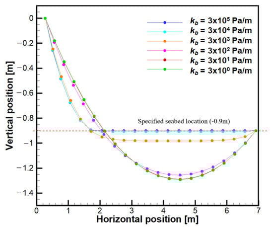 where and represent the diameter and segment length of the mooring line, respectively. and are the vertical coordinates of the seabed and node i, respectively, and means the vertical velocity of node i. and represent the stiffness and damping coefficients per unit area of the seabed, respectively. is the unit vector in the positive z-direction, so the seabed contact force acts in the upward direction only when the node i touches the seabed (. The stiffness coefficient supports the nodes so that they are located on the seabed. The positions of the nodes for various stiffnesses in the seabed model are shown in Figure 8. The stiffness of the seabed model must be sufficient to support the nodes at the seabed location against the net buoyancy, which is the sum of the weight and buoyancy of the node [20]. If the stiffness is not sufficient, the cable simply hangs in the air with two endpoints that are fixed; if the stiffness is sufficient, the nodes are located at the specified location as if the seabed is actually presented.
