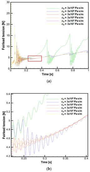 The fairlead tensions for various damping coefficients in the seabed model are shown in Figure 9 when the fairlead rises at a constant velocity. The damping coefficient causes to dissipate the kinetic energy and the static friction when the node touches and is lifted from the seabed, respectively. When the damping coefficient is excessively large, a significant discontinuous region appears in the fairlead tension. This is because excessive frictional force is applied when the node is lifted from the seabed, which is quite different from what appears in a real mooring line. In contrast, when the damping coefficient is very small, the fairlead tension appears to oscillate. When the node is lifted from the seabed, there is a small dissipation for the kinetic energy delivered to the adjacent node.