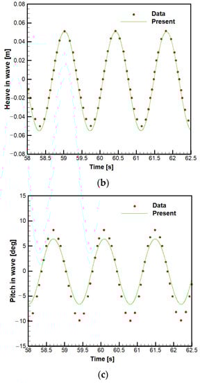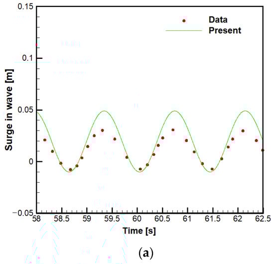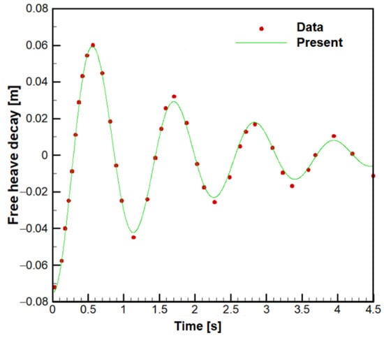 To evaluate the motions of a floating body, free decay tests in still water were conducted and compared with the experimental data [9,21]. The experiments were conducted with the cylindrical buoy in the wave tank of 15 m length, 5 m width, and 1.8 m depth, and the water depth was 0.9 m. The mass, diameter, height, and moment of inertia of the buoy were 35.85 kg, 0.515 m, 0.401 m, and 0.9 kg∙m2. The laminar flow condition was used because the velocity of the cylindrical buoy was very small. The analyses were performed until 4.5 s with the fixed time step size of 0.001 s, and the results compared with the experiment were shown in Figure 10. The heave motion showed good agreement with the experimental data. The period during four periods of 1.112 s. agreed well with the measured one of 1.110 s.