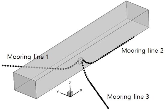 To evaluate the two-way coupled solver’s accuracy, the moored motions’ simulation in a wave and tensile loads of the mooring system was conducted. The properties of the mooring line used were summarized in Table 2. The Stokes 5th order wave was generated, and its properties were listed in Table 3. All numerical methods were identical with the case of the moored decay motions only, except that the RNG k-ε model and wave generation condition on inlet were applied instead of the laminar flow and still water conditions, respectively. In addition to the inlet and outlet boundaries, the relaxation zones whose lengths were 3 m (one wavelength) and 6 m (two wavelengths) were set to generate and absorb the wave effectively, respectively. More than 140 and 22 meshes per wavelength and height were located in the wave region to detect the free surface accurately. These numbers exceed the International Towing Tank Conference [22] guideline, which specifies 80 and 20 meshes per wavelength and height, respectively.