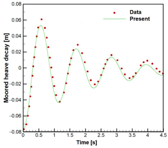 The analyses were performed until 4.5 s with the fixed time step size of 0.001 s for the heave motion. The results compared with the experiment [9,21] are shown in Figure 12. The moored heave motion showed good agreement with experimental data in the period and amplitude, but the equilibrium position of the motion tended to be slightly downward. It seems that the numerical conditions did not consider the increased draft caused by the addition of the mooring system. The average period during the four periods was 1.130 s, which was similar to the measured one of 1.114 s.