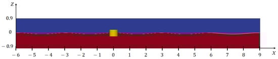 The initial buoy position and free surface for the moored buoy in the wave are shown in Figure 13, and the wavefield was initialized with the wave profile to reduce the computation time. The initial buoy position was the equilibrium position in still water. The analysis was performed until 65 s (about 46 periods) with the fixed time step size of 0.001 s to eliminate transient features that may arise in the early stage of the simulation.