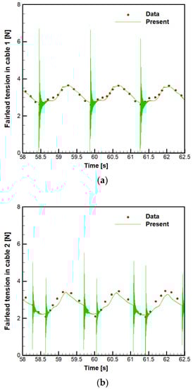 The fairlead tensions in the mooring lines are shown in Figure 15. The fairlead tensions of mooring line 1 (symmetric with the mooring line 3) on the seaward side and mooring line 2 on the leeward side were compared with the experiment results. They show good agreement in the amplitude, period, and pattern of the tension. Mooring line 1 shows a larger fairlead tension than mooring line 2 because the drift motion was generated from the equilibrium position to the leeward side. The pattern of the fairlead tensions also shows good agreement with the experiment and the local humps of the tension shown in the region in which the fairlead tension increases were predicted very well. In addition, local humps of the fairlead tension appeared when the direction of the surge and pitch motions is changed, and then the velocity increases, which seemed to be due to the increase in the transverse drag force of the mooring line the angle of the mooring line changes.