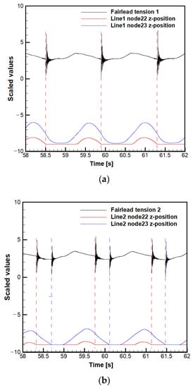 In the region with low fairlead tension, strange noises appeared. To analyze them, the fairlead tensions and vertical locations of the mooring line nodes were scaled and shown in Figure 16. It was found that these noises are generated when the mooring line nodes touch the seabed. In the case of mooring line 1, the noise appeared once during one period, and it appeared when the twenty-second node touched the seabed. During the same period, the twenty-third node never touched it. In the case of mooring line 2, the noises appeared twice during one period and appeared when the twenty-second and twenty-third nodes touched the seabed, alternatively. It seemed that the noises’ appearance is related to the mooring line discretization and the characteristics of MoorDyn, which ignores the bending moment and compression force acting on the mooring line. The noises can be minimized by properly selecting the stiffness and damping coefficients of the seabed model. Since these noises disappeared within a short time and the fairlead tension was immediately restored to the normal condition, the effect on the motions of the buoy seemed to be insignificant.
