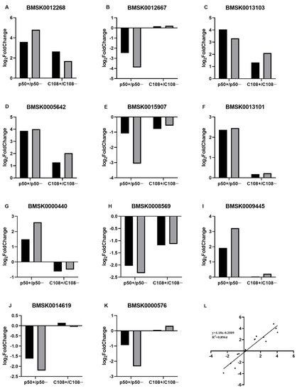 Correlation analysis between gene expression ratios obtained from transcriptome data and RT-qPCR. (A–K) Expression ratios (log2 fold change) were obtained from RT-qPCR and transcriptome data. (L) Lineage analysis between the transcriptome and RT-qPCR. The ratios obtained by RT-qPCR (x-axis) were plotted against the ratios obtained by RNA-Seq (y-axis).