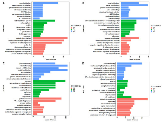 GO analysis of DEGs in differentially resistant strains following inoculation. These genes were divided into three groups based on cellular components. Biological process (BP), cellular component (CC), and molecular function (MF). (A) Upregulated DEGs in p50+ vs. p50− group, (B) upregulated DEGs in C108+ vs. C108− group, (C) downregulated DEGs in p50+ vs. p50− group, (D) downregulated DEGs in C108+ vs. C108− group.