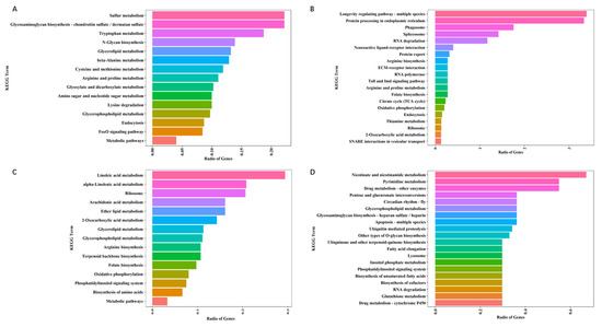 KEGG pathway enrichment analysis of DEGs in differentially resistant strains following inoculation. (A) Upregulated DEGs in p50+ vs. p50− group, (B) upregulated DEGs in C108+ vs. C108− group, (C) downregulated DEGs in p50+ vs. p50− group, (D) downregulated DEGs in C108+ vs. C108− group.