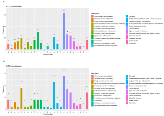 KOG annotation of DEGs in differentially resistant strains following inoculation. (A) DEGs in p50+ vs. p50− group, (B) DEGs in C108+ vs. C108− group.