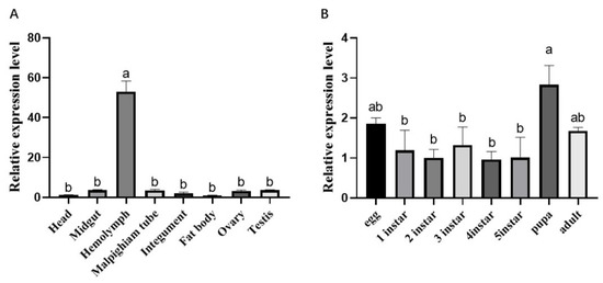Expression analysis of BmTex261 in different tissues and developmental stages using RT-qPCR. (A) Relative expression levels of BmTex261 among different tissues; (B) relative expression levels of BmTex261 among different stages. BmGAPDH was used to normalise the data that are shown as the mean ± standard error; the mean was obtained from three independent repeats. The 2−ΔΔCt method was adopted to calculate the relative expression level. The statistical difference among three biological duplicates, determined with one-way ANOVA, is shown via graphpad prism. Different letters indicate statistically significant differences (a, b; p < 0.05).