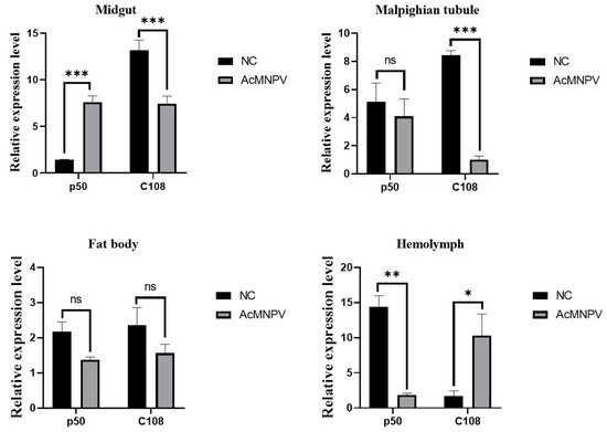The expression levels of BmTex261 in the hemolymph, midgut, malpighian tubule, and fat body in p50 (susceptible strain) and C108 (resistant strain) were detected after injection with AcMNPV. The expression levels of BmTex261 in the hemolymph of the p50 strain were significantly downregulated after injection with AcMNPV as compared to the control group (Figure 7), whereas the expression of BmTex261 was upregulated in the midgut of p50 (Figure 7).