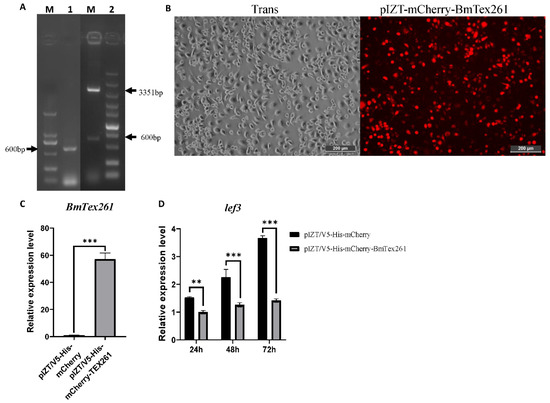 To further explore the function of BmTex261 in response to AcMNPV, the recombinant plasmid of pIZT-mCherry-BmTex261 was constructed (Figure 8A) and transfected into the BmN cells to overexpress BmTex261 (Figure 8B). The stable BmN cell line contained pIZT-mCherry-BmTex261 were generated by a final concentration of 200 µg/mL zeocin. The overexpression of BmTex261 was detected by increasing about 56-fold over the control group. Furthermore, the expression of lef3 of AcMNPV in the overexpression group was significantly decreased as compared to the control group at 24 h, 48 h, and 72 h after AcMNPV infection (Figure 8C).