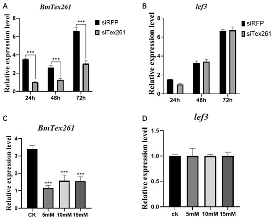 Analysis of AcMNPV infection after knocking down BmTex261 in BmN cells. (A) Expression analysis of BmTex261 after siTex261 transfection at different durations by using RT-qPCR. (B) Analysis of lef3 expression after knockdown of BmTex261 at different durations after AcMNPV infection. (C) Relative expression levels of BmTex261 after adding different concentrations of CaCl2; (D) relative expression levels of lef3 after adding different concentrations of CaCl2. BmGAPDH was used to normalise the data that are shown as the mean ± standard error; the mean was obtained from three independent repeats. The 2−ΔΔCt method was adopted to calculate the relative expression level. The statistical difference among three biological duplicates, determined with one-way ANOVA, is shown via graphpad prism. The level of statistical significance was set at ***, p < 0.001.