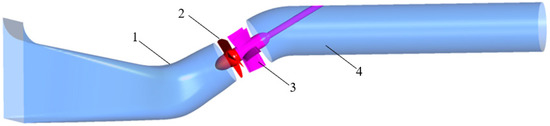 Three-dimensional model of slanted axial-flow pump device. (1) Elbow inlet oblique inlet flow channel, (2) impeller, (3) guide vane, and (4) straight pipe outlet flow channel.
