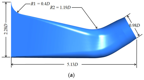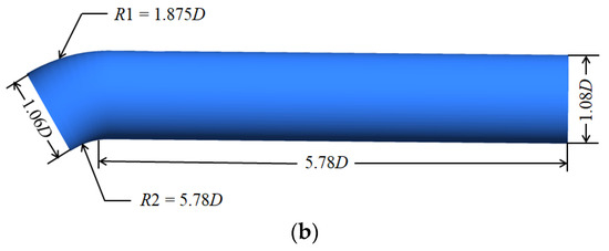 Dimensional drawing of elbow oblique inlet flow channel and straight pipe outlet flow channel. (a) Elbow oblique inlet flow channel, (b) straight pipe outlet flow channel.