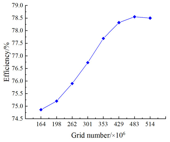 The grid independence analysis of the whole pump device was carried out under the optimal working conditions, and the numerical simulation was carried out using eight groups of grids from 1.64 million to 5.14 million. The efficiency calculation results corresponding to different grid numbers were compared and analyzed. The relationship curve between the overall grid number and efficiency of the pump device is shown in Figure 3. It can be seen from Figure 3 that the efficiency of the pump device increased with the increase in the number of grids. When the number of grids ranged from 1.64 million to 4.29 million, the efficiency increase was relatively large; when the number of grids reached 4.29 million, the efficiency change trend tended to be flat. When the number of grids was increased to 4.83 million, the efficiency increase was within 0.3%, which met the accuracy requirements of numerical simulation.