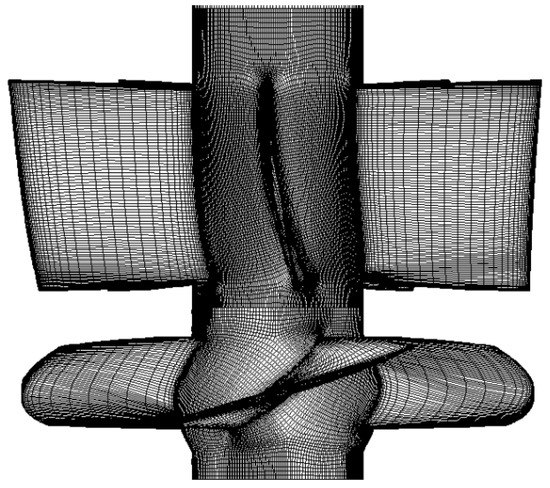 When designing the flow conditions, the y+ values of the flow components of the slanted axial-flow pump device studied in this paper were as follows: the elbow oblique inlet flow channel was about 289, the impeller was about 28, and the guide vane body was about 53. The straight pipe outlet flow channel was about 201, which met the requirements of numerical simulation solution [26,27]. The impeller guide vane grid is shown in Figure 4. The impeller mesh details are shown in Figure 5.