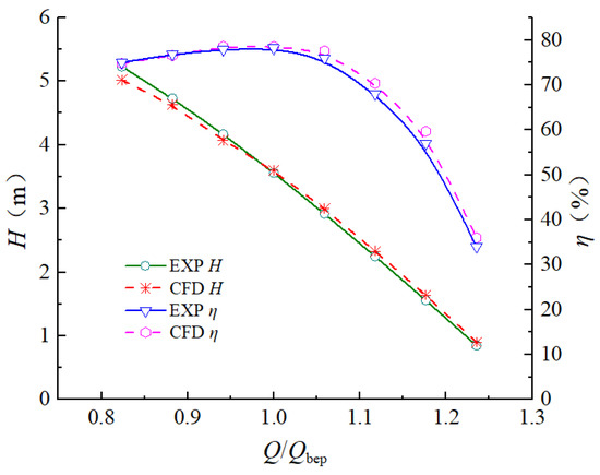 The physical model test bench of the 30° slanted axial-flow pump device was tested in accordance with the water conservancy industry standard of the People’s Republic of China Code of Practice for Model Pump and Its Installation Acceptance Tests (SL140-2006). The nominal diameter of the impeller used in the model test was 300 mm, the rotational speed was 1400 r/min, the number of blades of the impeller was four, the number of blades of the guide blade was five, and the blade placement angle was 0°. The physical model test diagram of the 30° slanted axial-flow pump device is shown in Figure 6. The nD value is another expression of the impeller flange velocity of axial flow pump, which reflects an abstract index of the energy and cavitation characteristics of the pump device. Therefore, the cavitation performance and energy performance of the prototype pump and the model pump should be maintained with the same cavitation performance and energy performance, so that the nD value of the model pump and the prototype pump is equal. In order to verify the reliability of the numerical simulation, the geometric size of the prototype pump device was converted to the model according to the principle of equal nD value. The impeller speed of the converted physical model pump device was 1400 r/min and the nominal diameter of the impeller was 0.3 m. The prototype of the flow structure was scaled to the model according to the scale of 0.1786. Under the condition of 0° blade placement angle, the head and efficiency of the pump device model under different flow conditions were collected. The equivalent efficiency conversion method was used to convert the physical model test results of the pump device to the prototype. The performance results of the converted physical model were compared with the energy performance results of the numerical simulation, as shown in Figure 7. The variation trend of the performance curve predicted by the model of the 30° slanted axial-flow pump device studied in this paper was basically consistent with that of the test curve. The maximum difference between the head of the pump device predicted by the numerical simulation and the physical model test was 4.0%, and the minimum difference was 1.2%. The maximum difference between the efficiency of the pump device predicted by the numerical simulation and the physical model test was 5.88%, and the minimum difference was 0.3%. The small error indicates the effectiveness and reliability of the numerical simulation of the 30° slanted axial-flow pump device.