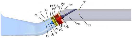 In order to monitor and analyze the pressure fluctuation in the inlet and outlet passages and the blade area of the slanted axial-flow pump device, a total of 19 pressure fluctuation monitoring points were set up. The monitoring points were arranged as shown in Figure 8. Six monitoring points were arranged in the elbow oblique inlet flow channel passage: Monitoring points 1 and 4 were 0.417D from the impeller center line, monitoring points 2 and 5 were 0.595D from the impeller center line, and monitoring points 3 and 6 were 0.833D from the impeller center line. The pressure pulsation monitoring points P7–P9 were arranged at the impeller inlet (distance from the impeller centerline 0.167D), and the pressure pulsation monitoring points P10–P12 were arranged at the interface between the impeller and the guide vane body (distance from the impeller centerline 0.167D). Pressure pulsation monitoring points P13–P15 were arranged at the outlet of the body (0.76D from the centerline of the impeller), and the three cross-section pressure pulsation monitoring points were equidistantly distributed. The pressure pulsation monitoring points P7–P9 were arranged at the impeller inlet (distance from the impeller centerline 0.167D), and the pressure pulsation monitoring points P10–P12 were arranged at the interface between the impeller and the guide vane body (distance from the impeller centerline 0.167D). Pressure pulsation monitoring points P13–P15 were arranged at the outlet of the body (0.76D from the centerline of the impeller), and the three cross-section pressure pulsation monitoring points were equidistantly distributed. Four monitoring points were arranged in the straight pipe outlet flow channel. Monitoring points 16 and 18 were 1.190D away from the impeller center line, and monitoring points 17 and 19 were 4.727D away from the outlet section of the slanted axial-flow pump device.