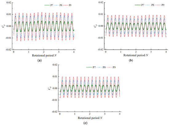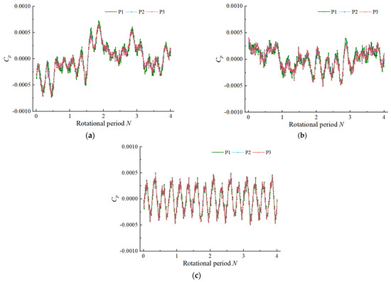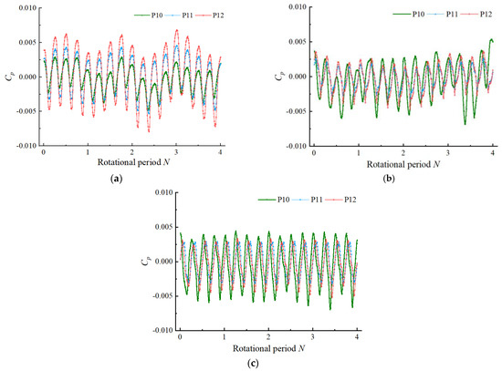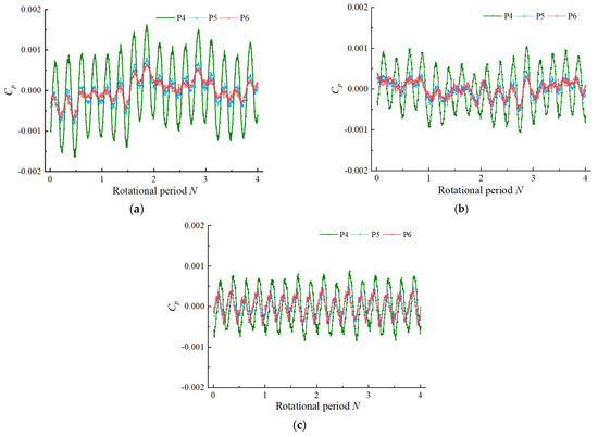 Figure 9 shows the time domain diagrams of the pressure fluctuation of the monitoring points 1–3 in the elbow oblique inlet flow channel. Monitoring points 1–3 were located at the hub side. At each flow condition, the pressure law and pressure value of the monitoring points 1–3 were approximately equal, and the distance from the monitoring point to the impeller inlet section had no obvious effect on the pressure of the monitoring point. The pressure coefficient of monitoring points 1–3 was in the range of −0.0005–0.0005, and did not change greatly with the change of flow rate. Under the condition of 0.8 Qbep, the pressure fluctuation range in four rotation cycles was large and did not show regularity. Under the condition of 1.0 Qbep, the fluctuation range of the maximum and minimum values in the pressure fluctuation time domain diagram was significantly improved compared with that under the condition of 0.8 Qbep. When the flow rate increased to 1.2 Qbep, the pressure pulsation of monitoring points 1–3 had a strong regularity, and there were four peaks and four troughs in a rotation cycle, indicating that the pressure of monitoring points 1–3 was affected by the impeller rotation under the 1.2 Qbep condition.
