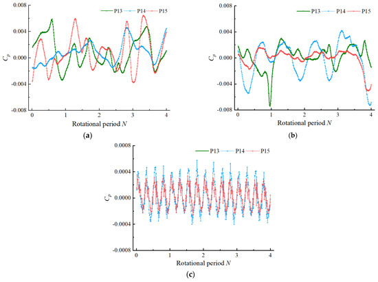 Time domain diagram of pressure fluctuation at impeller inlet: (a) 0.8 Qbep, (b) 1.0 Qbep, (c) 1.2 Qbep.