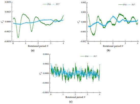 Time domain diagram of pressure fluctuation at monitoring points 16–17of the straight pipe outlet flow channel: (a) 0.8 Qbep, (b) 1.0 Qbep, (c) 1.2 Qbep.
