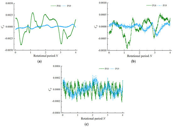 Time domain diagram of pressure fluctuation at monitoring points 18–19 of the straight pipe outlet flow channel: (a) 0.8 Qbep, (b) 1.0 Qbep, (c) 1.2 Qbep.
